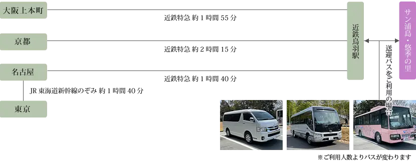 近鉄鳥羽駅1番出口より「サン浦島悠季の里」のバスがお迎えに参ります。事前ご予約の上、車体に「悠季の里」と入ったバスにご乗車下さいませ。