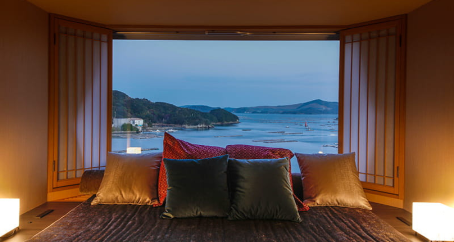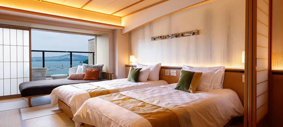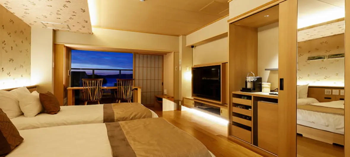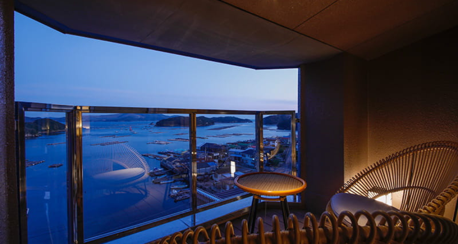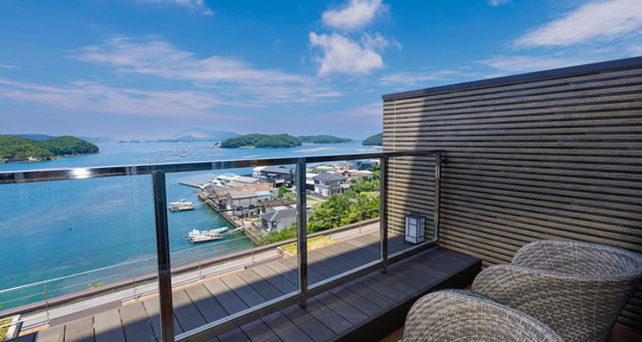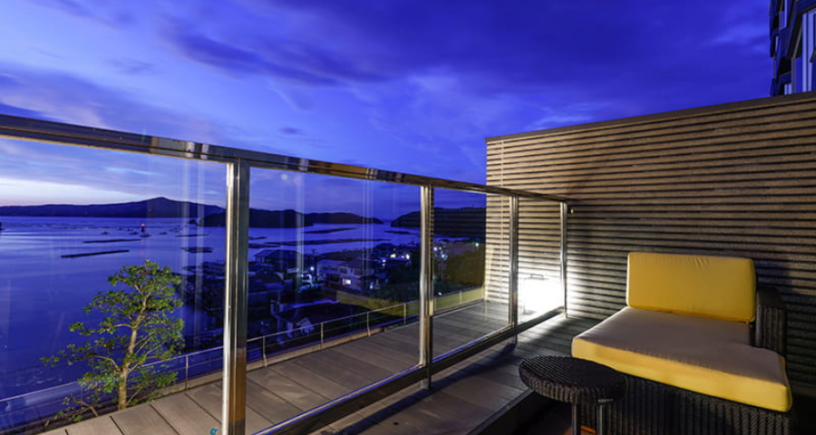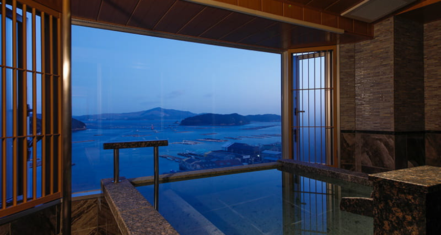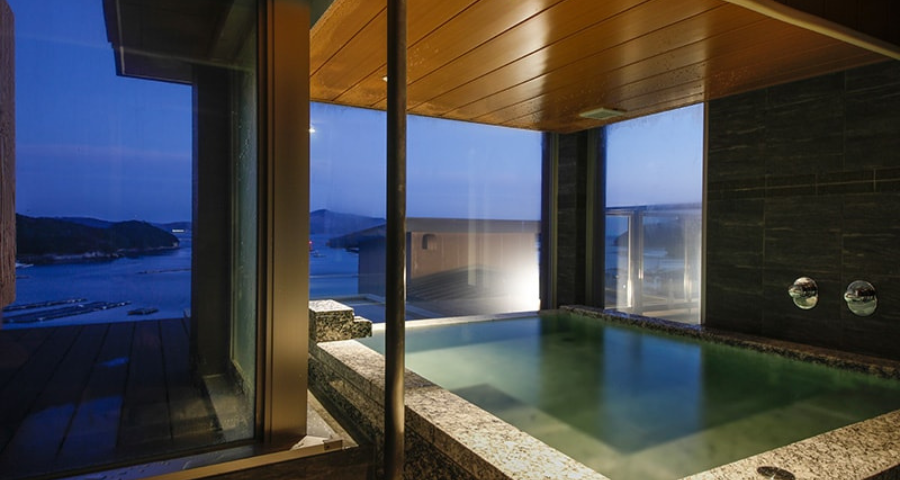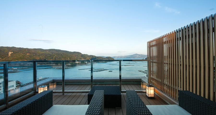 最上階のフロアに位置し、お部屋からはもちろん、温泉露天風呂からも海の景観をご覧いただけます。