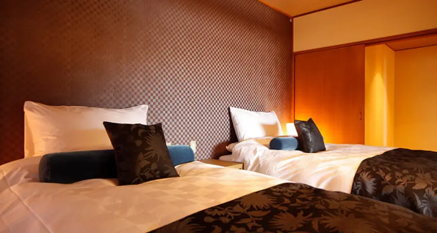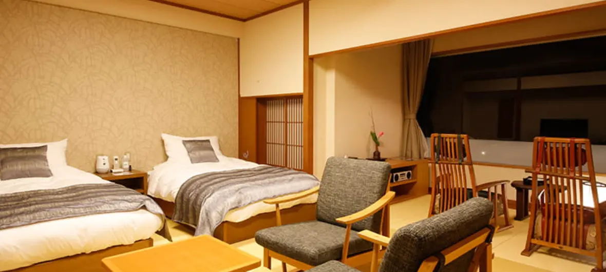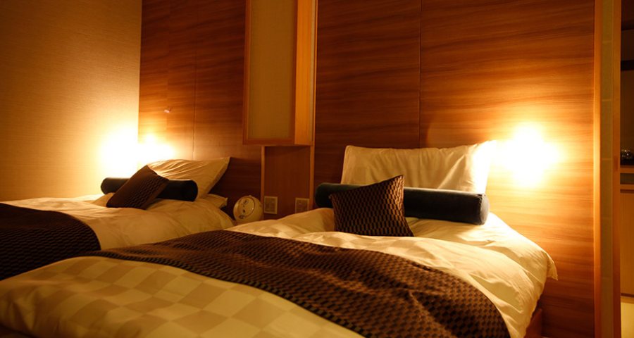14畳の和室に備えられたベッドは最高級シモンズ製。ツインでのご利用はもちろん、お子様連れでもご一緒にお休みいただけるように、ベッドをくっつけることも可能です。内湯は源泉100%の温泉をひいております。