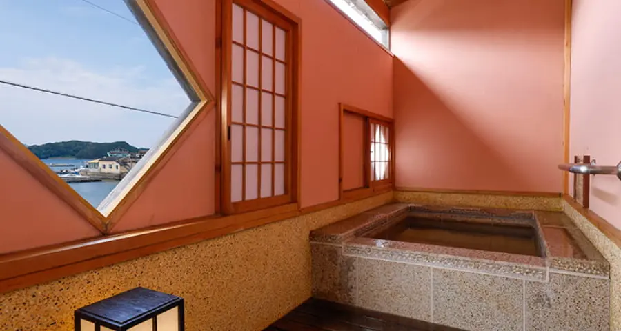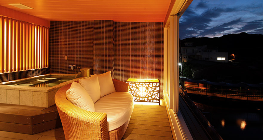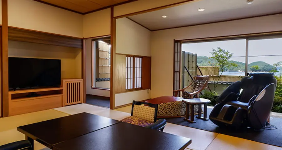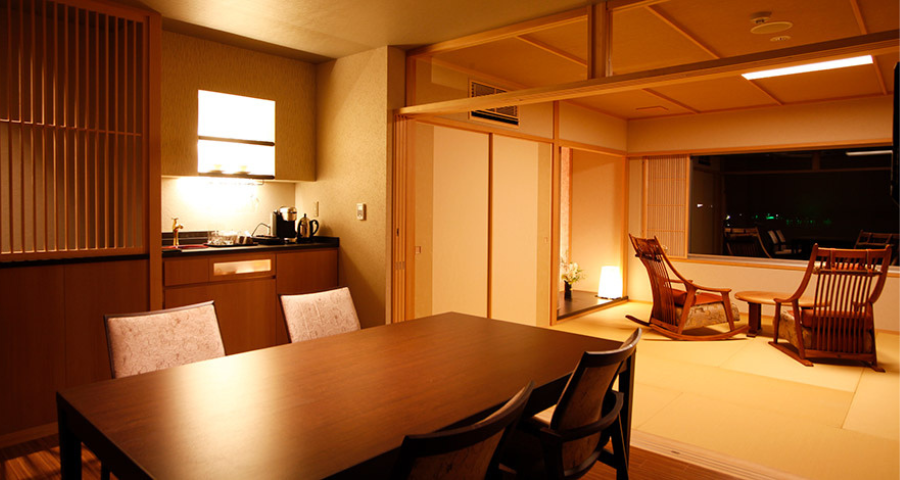 ご高齢のお客様やお子様にも快適に過ごしていただけるように、半バリアフリータイプの客室です。トイレスペースは車椅子でもご利用できるよう広くし、スロープなどもある部屋のつくりとなっております。(※完全バリアフリーではございません。)伊勢湾の美しい情景を見ながら入れる露天風呂は2名様でもゆったりお入りいただける広さ。お食事は客室内のプライベートダイニングにてお食事をお楽しみいただけます。